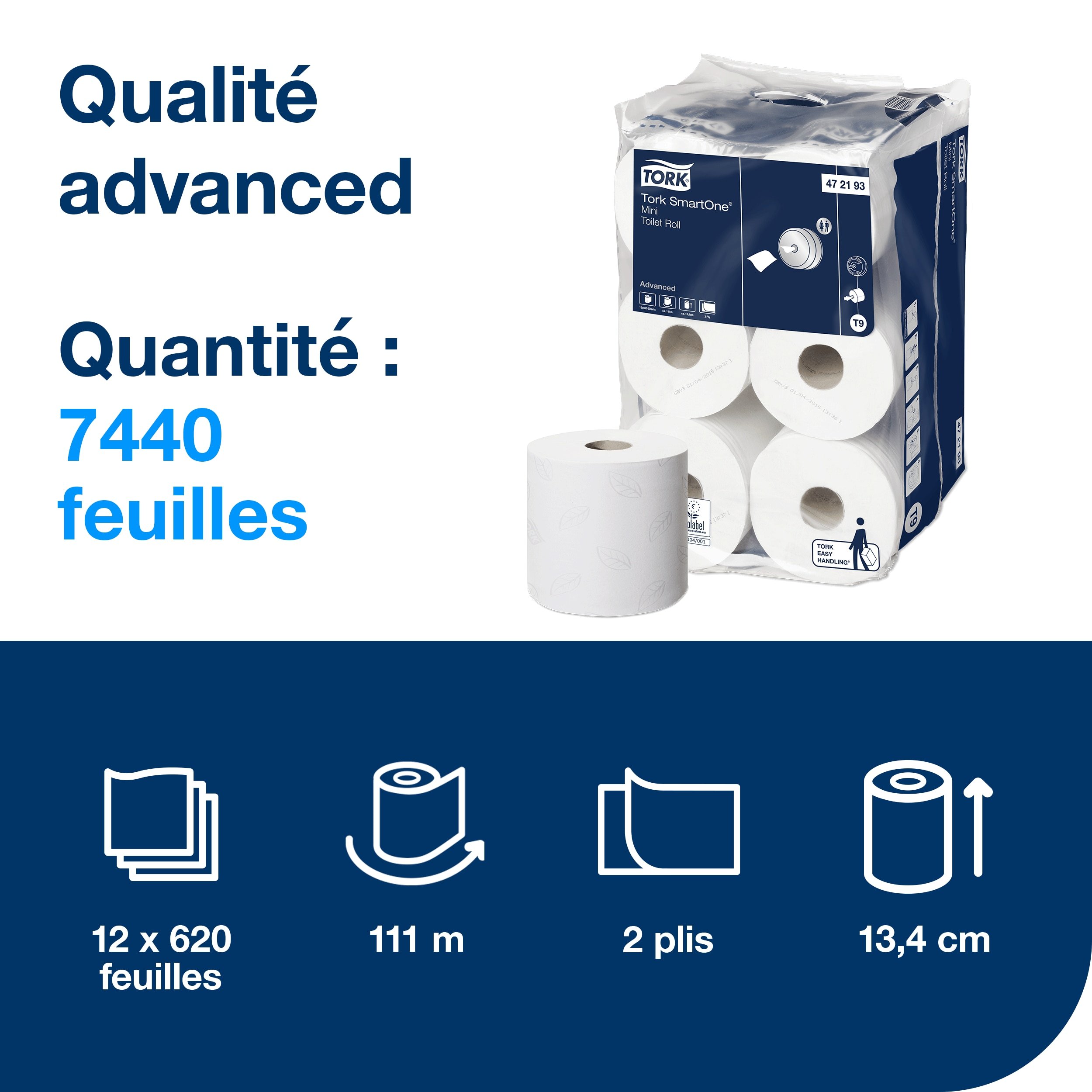Le mini distributeur pour papier toilette rouleau Tork SmartOne distribue une feuille de papier hygiénique à la fois, permettant de réduire la consommation jusqu’à 40 % par rapport aux distributeurs pour rouleaux Jumbo traditionnels et couvrant ainsi plus de visites par rouleau. Les rouleaux Tork SmartOne Mini de grande capacité sont adaptés aux sanitaires exigeants à fréquentation faible, moyenne ou élevée, selon le distributeur Tork SmartOne Mini choisi.